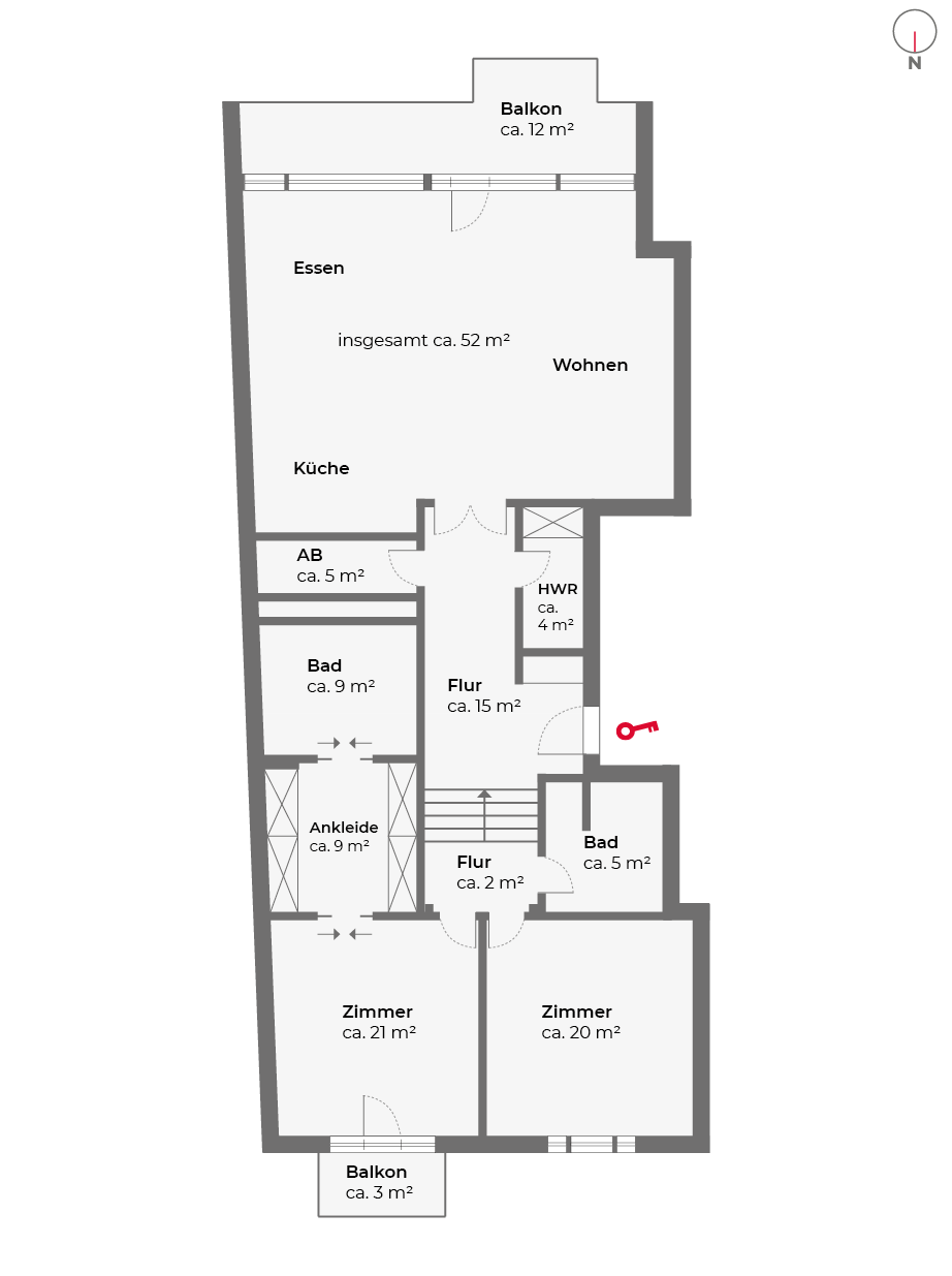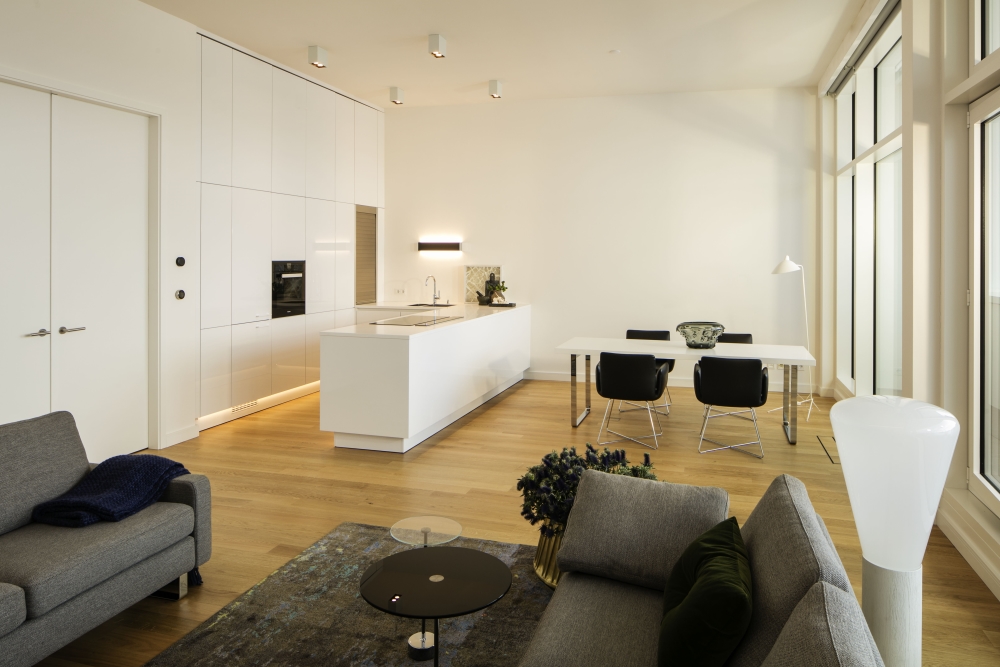 Die ansprechende Wohnung befindet sich im 3. Obergeschoss, verfügt über etwa 150 m² Wohn- und Nutzfläche und verteilt sich auf drei Zimmer. Exklusivität durch und durch: Geputzte Wände, helles Eichenparkett, bis zu ca. 3,60 m hohe Decken und Einbauschränke gehören zur hochwertigen Ausstattung. Die offene und moderne Küche ist mit hellen Einbauten und Geräten der Marke Miele ausgestattet. Der private Bereich: ein Schlafzimmer mit Ankleide und Vollbad en suite sowie ein zweites Zimmer mit angrenzendem Duschbad. Hinzu kommen ein Hauswirtschaftsraum, Abstellräume und ein Tiefgaragenstellplatz. Das Highlight: zwei Balkone.